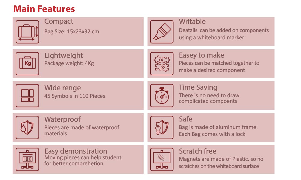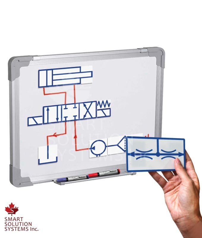 The symbols are made of waterproof materials and adhere to a metal-backed board. Connections and designations are marked with the whiteboard marker. This symbol set is very useful to explain experimental pneumatics circuits to a classroom of students.